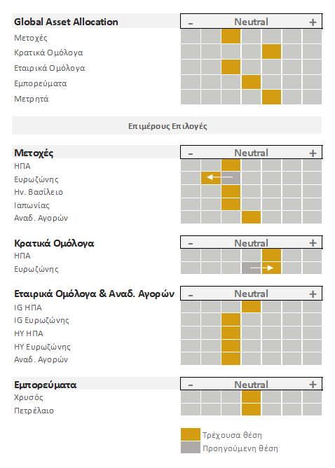 Στα κρατικά ομόλογα των ΗΠΑ, η άποψή μας παραμένει ήπια θετική ενώ στην Ευρωζώνη αναβαθμίζεται σε ήπια θετική από ουδέτερη. Στα εταιρικά ομόλογα, η άποψή μας παραμένει ήπια αρνητική εκτός από τα Επενδυτικής Διαβάθμισης (IG) των ΗΠΑ που παραμένει ουδέτερη.