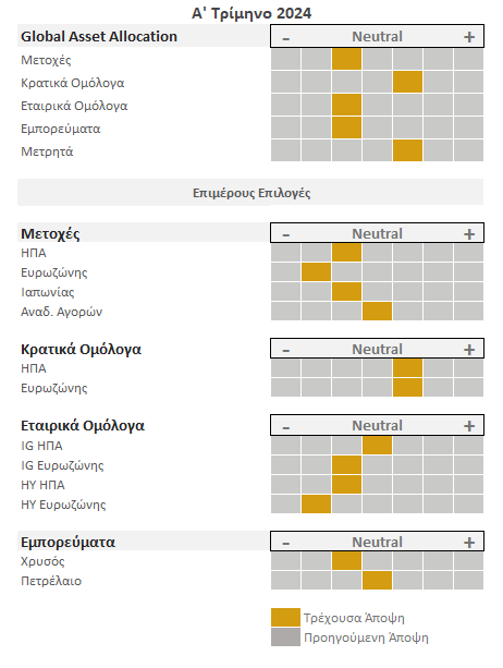 Η προσδοκία μας είναι ότι σε δεύτερο χρόνο, τυχόν διόρθωση των αγορών, σε συνδυασμό με το γεγονός ότι από τα μέσα του 2024 οι αγορές θα αρχίσουν να προεξοφλούν τα κέρδη του 2025, είναι πιθανό να δημιουργήσουν ένα παράθυρο για εκ νέου μεταβολή στις απόψεις μας για μετοχές σε θετική.
