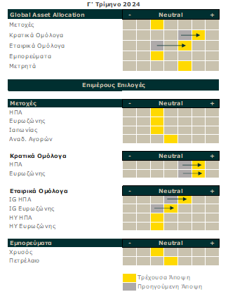 Παράλληλα, πιστεύουμε ότι η επιτάχυνση της μείωσης των επιτοκίων δημιουργεί θετικές συνθήκες στις αγορές ομολόγων όπου αυξάνουμε περισσότερο την προτίμησή μας στα Κρατικά Ομόλογα ΗΠΑ και Ευρωζώνης. Θεωρούμε ότι και στις δύο περιπτώσεις η αγορά υποεκτιμά το εύρος της μείωσης των επιτοκίων που είναι απαραίτητες για την τόνωση της οικονομικής δραστηριότητας. Τέλος, η θετική μας στάση για τα κρατικά ομόλογα δύναται να προσφέρει ένα βαθμό ασφάλειας σε περίπτωση αύξησης του γεωπολιτικού ρίσκου.