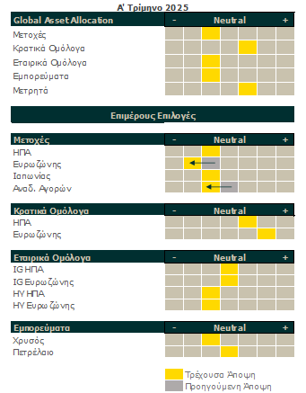Στην μετοχική κατηγορία, μεταβάλλουμε την άποψή μας για τις ευρωπαϊκές μετοχές σε αρνητική από ήπια αρνητική καθώς μας προβληματίζει η αναπτυξιακή δυναμική. Στις ΗΠΑ παραμένουμε ήπια αρνητικοί λόγω μη ελκυστικών αποτιμήσεων, ωστόσο προτιμούμε τους κλάδους Κοινής Ωφέλειας, Dividend Aristocrats, Υγείας, Ενέργειας, Τραπεζών και προσθέτουμε τον Υπηρεσιών Επικοινωνίας ως τον πιο ελκυστικό από τους κλάδους ανάπτυξης.