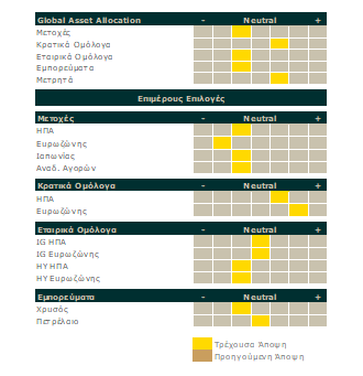 Στην μετοχική κατηγορία διατηρούμε την ήπια αρνητική μας άποψη. Στις ΗΠΑ παραμένουμε ήπια αρνητικοί λόγω μη ελκυστικών αποτιμήσεων, ωστόσο προτιμούμε αμυντικούς κλάδους όπως αυτούς της Κοινής Ωφέλειας, Dividend Aristocrat και Υγείας. Προτιμούμε επίσης κυκλικούς κλάδους με ισχυρά θεμελιώδη όπως οι Τράπεζες, η Ενέργεια και οι Υπηρεσίες Επικοινωνίας.