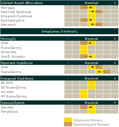 Στα ομόλογα, παρά το γεγονός ότι αναμένουμε τα βραχυχρόνια επιτόκια να συνεχίσουν να αποκλιμακώνονται, θεωρούμε ότι τα ρίσκα για τα ομόλογα μεγάλης διάρκειας συνεχίζουν να αυξάνονται. Για το λόγο αυτό αναθεωρούμε την άποψή μας για τα αμερικανικά κρατικά ομόλογα σε ουδέτερη (από ήπια θετική) και για τα ευρωπαϊκά κρατικά σε ήπια θετική (από θετική). Τέλος θεωρούμε ότι ο χρυσός θα διατηρήσει την ανοδική του δυναμική, υποστηριζόμενος από τις συνεχιζόμενες αγορές από τις ανά τον κόσμο Κεντρικές Τράπεζες.