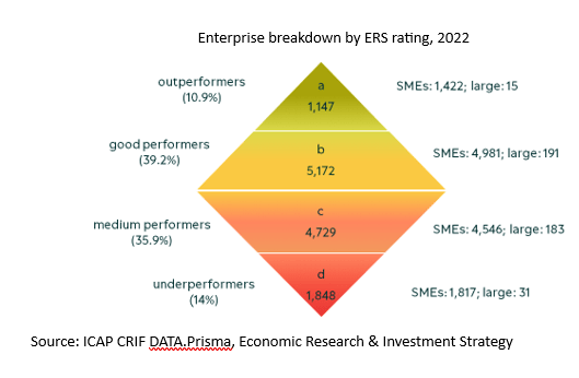 In 2022, we witnessed a movement of distribution toward higher ratings among the companies, in comparison with 2019. The enterprises that outperformed (“a”) constituted 10.9% of the sample. 39.2% of the enterprises had good but less satisfactory performance (“b“) and were the largest percentage of the sample. The enterprises that fell behind significantly (“c”) accounted for 35.9% of the sample. Finally, enterprises with serious problems (“d”) accounted for 14% of the sample.